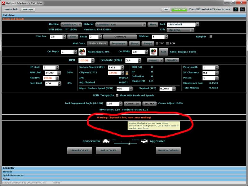 - Fixed a number of serious bugs. Among them: indexable and facemills were completely wrong on their IPT information and carbide twist drills had some bad feed and speed data.